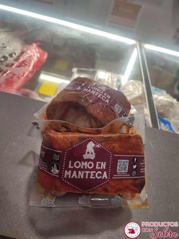LOMO EN MANTECA COLORADA Lomos de cerdos marinados en especias naturales, bañado en manteca de cerdo ibérico. Piezas de 500Gr.