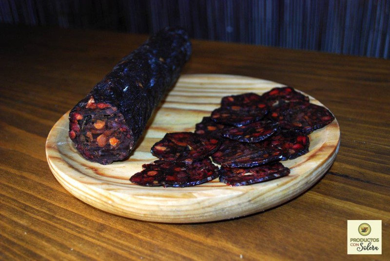 INGREDIENTES: Carne y grasa de cerdo ibérico, sangre de cerdo, especias, sal, dextrina, dextrosa, proteína de cerdo, conservadores (E252, E250), corrector de acidez (E33liii). tripa no comestible.
