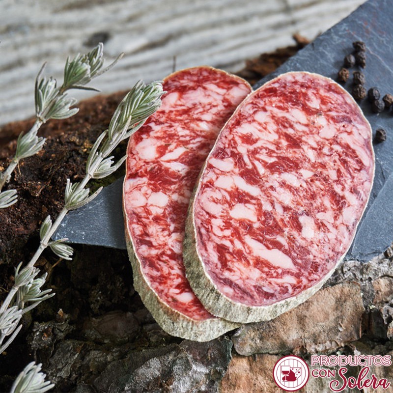 Salchichón cular ibérico, de cerdos ibéricos criados en libertad. Elaborado con carnes de la mejor calidad, de forma artesanal y con tripa natural. Procedencia SALAMANCA. FORMATO: 1/2 PIEZAS 700GR.